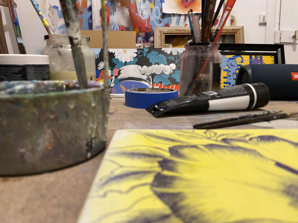 Yugipop commence la peinture il y a plusieurs années, de manière instinctive, guidé par le besoin d’exprimer des émotions fortes à travers des formes, des visages, des symboles et des couleurs éclatantes. Rapidement, son style singulier attire l’attention : des compositions vibrantes, entre pop art, influences street et une touche de mode, de musique et de danse qui insufflent un mouvement vivant à ses toiles.